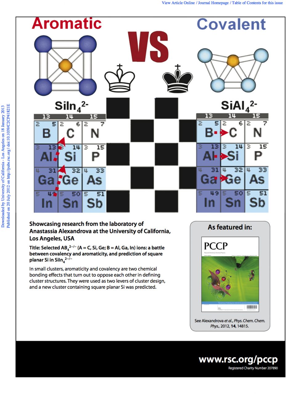 Alexandrova, A. N.;* Nayhouse, M. J.; Huynh, M. T.; Kuo, J. L.; Melkonian, A. V.; Chavez, G. De J.; Hernando, N. M.; Kowal, M. D.; Liu, C.-P. Selected AB42-/- (A = C, Si, Ge; B = Al, Ga, In) Ions: A Battle between Covalency and Aromaticity, and Prediction of Square Planar Si in S iIn42-/-. 2012 Phys. Chem. Chem. Phys. 14, 14815-14821. Invited article. Featured on Journal Cover. Highlighted in UCLA Newsroom. Download